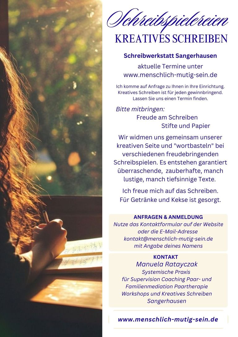 Kreatives Schreiben ist auch eine Möglichkeit, Verlusterfahrungen in Worte zu fassen, die vielen schönen Erinnerungen an gemeinsame Zeiten aufzuschreiben, den eigenen Weg mit der Trauer zu reflektieren, schöne Momente und neue Schritte im heutigen Leben zu wertschätzen oder der Fantasie freien Lauf zu lassen.